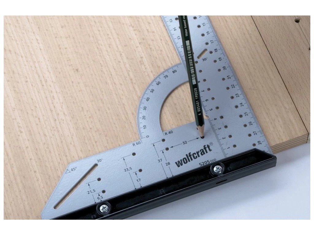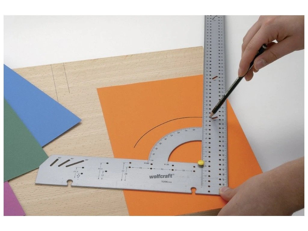 k měření, rýsování a značení, na poloměry, kruhy a miskové závěsy, vyměnitelný doraz pro přesnou práci na hranách a na plochách po obou stranách obrobku, provedení: plochý úhelník, stupnice úhloměru, paralelní rýsovací jehla, rýsovací šablona, úhlový doraz: 90°, raster: 32 mm