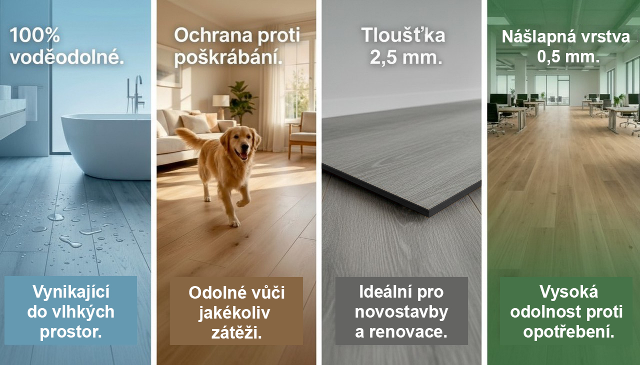 Hlavní předností je tloušťka 2,5 mm, která dává podlaze extra pevnost a extrémní stabilitu. Podlaha se příjemně chová při chůzi, je odolnější vůči běžnému namáhání a díky robustnější konstrukci lépe drží tvar i na větších plochách.